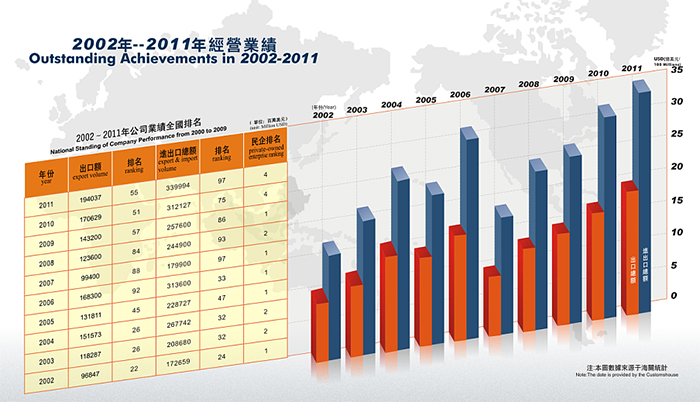 近年來,公司發(fā)展勢頭良好, 2014年公司實際出口額達(dá)到10.5億美金,排名“2014中國出口200強(qiáng)”第192名,其中民營企業(yè)排名第21名。公司先后獲得 “中國守合同重信用企業(yè)”、 “廣東省先進(jìn)集體”、“廣東省優(yōu)秀民營企業(yè)”、“東莞市50強(qiáng)民營企業(yè)”,“東莞市文明單位”等稱號,公司被東莞市政府授予“東莞市50強(qiáng)民營服務(wù)業(yè)企業(yè)”光榮稱號,公司董事長陳海生被授予“東莞市優(yōu)秀民營企業(yè)家”光榮稱號。